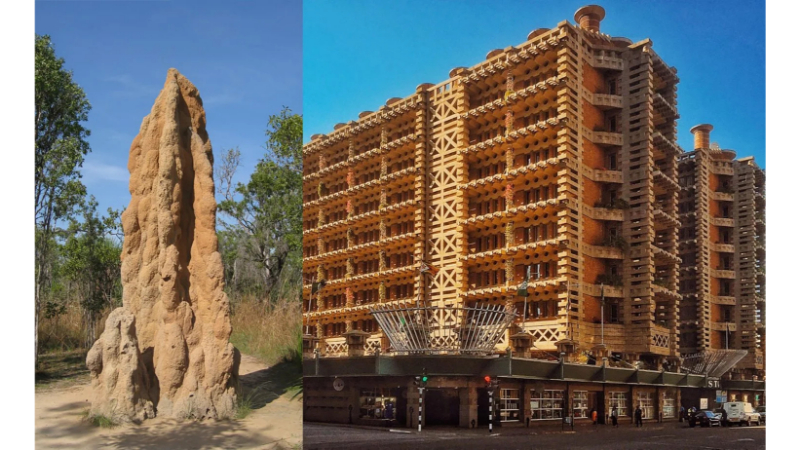 Doğadaki canlılardan esinlenerek geliştirilmiş teknolojik araçlar mimari alanında da etkilidir. Afrika termitleri, yuvalarını doğal klima sistemiyle inşa eder. Yuvalardaki hava kanalları sıcak havayı dışarı atar ve soğuk havayı içeri çeker. Mimar Mick Pearce, bu prensibi Zimbabwe’deki Eastgate Centre binasında kullanmıştır.