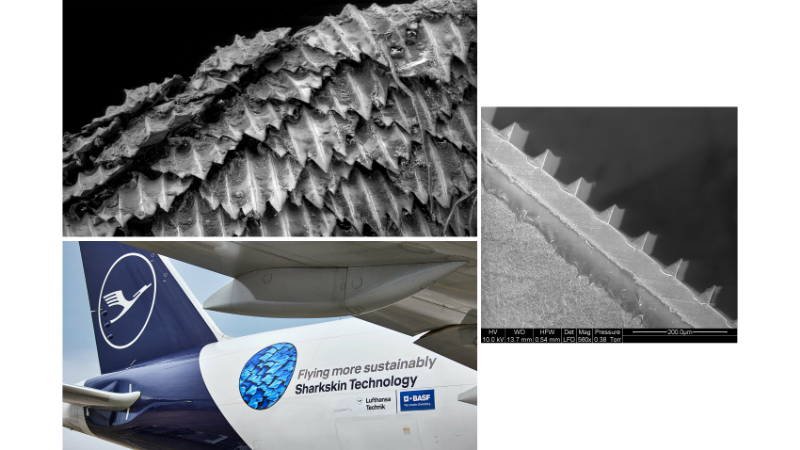 Doğadaki canlılardan esinlenerek geliştirilmiş teknolojik araçlar arasında havacılıkta devrim yaratan örneklerden biri köpekbalığı derisidir. Köpekbalığının derisi üzerindeki küçük diş benzeri yapılar (dentiküller), suda sürtünmeyi büyük oranda azaltır ve daha hızlı yüzmesini sağlar. Bu yapı, havacılık mühendisleri tarafından “riblet” teknolojisi olarak uçak kanatlarına ve gövdesine uyarlanmıştır. Mikroskobik oluklar sayesinde hava akışı daha düzenli hale gelir ve türbülans azalır.