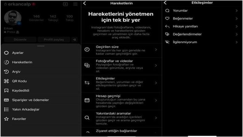 Instagram’da beğendiğim gönderileri görme işlemini yapmak için Instagram mobil uygulamasını açın. Sağ alttaki profil fotoğrafınıza dokunun. Profil sayfanız açıldıktan sonra sağ üst köşedeki üç çizgi (☰) menü simgesine tıklayın. Açılan menüden “Aktiviteniz” seçeneğine girin. Burada “Beğeniler” (Likes) bölümünü göreceksiniz. Bu bölüme dokunduğunuz anda kronolojik sırayla tüm beğendiğiniz gönderiler listelenir.
