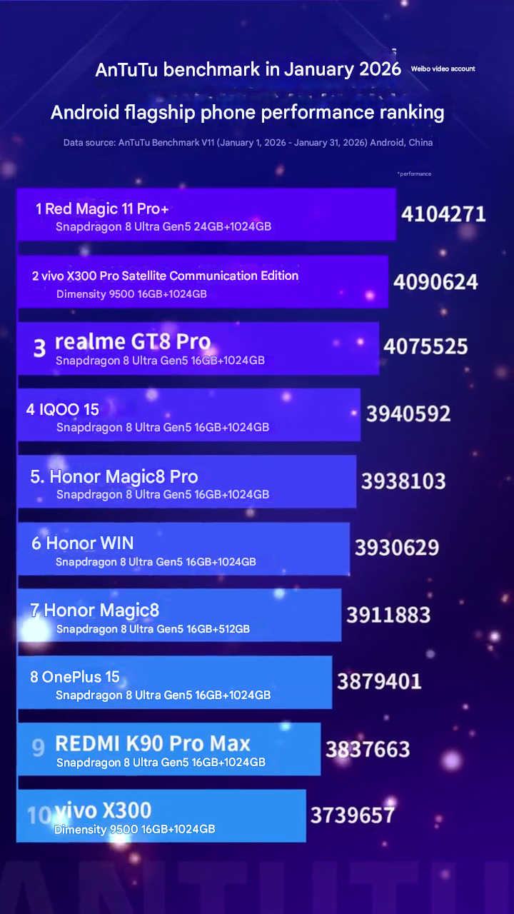 Listenin ilk sırasında yer alan RedMagic 11 Pro+, ortalama 4.104.271 puan alarak AnTuTu’nun Ocak 2026 lideri olmayı başardı. Bu skor, sadece kâğıt üzerinde değil, gerçek kullanım senaryolarında da işlemcinin ne kadar agresif bir performans sunduğunu açıkça gösteriyor. Özellikle oyun odaklı telefonlarda Snapdragon 8 Elite Gen 5’in neden bu kadar tercih edildiği bu sonuçla netleşmiş durumda.